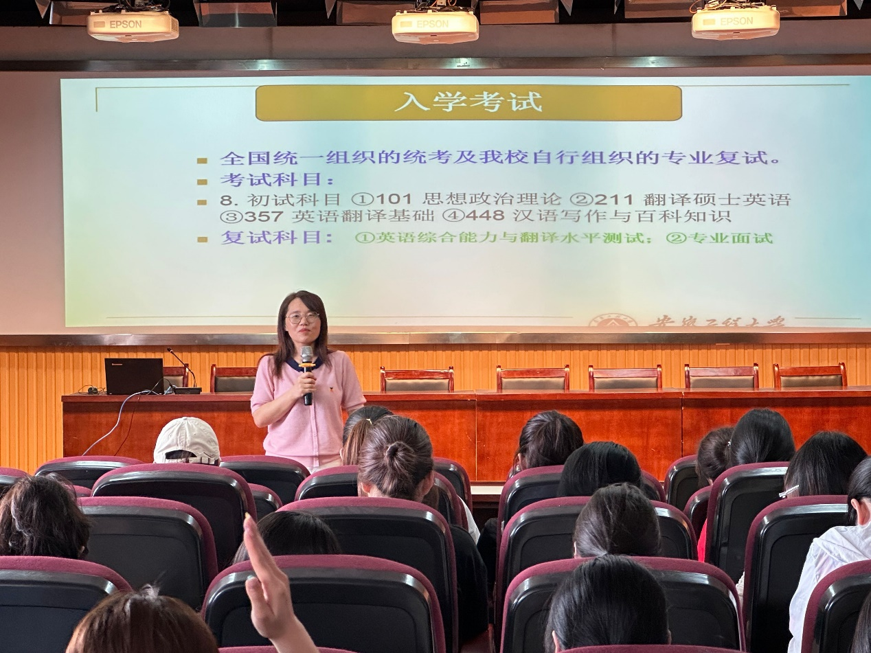 在互动交流环节中,安徽工程大学在校翻译硕士研究生结合自己的考研经历从备考计划、学习方法、心态调整等方面向学弟学妹们传授经验。参会员工围绕“翻译硕士就业竞争力提升”“理工类院校外语专业特色”等进行提问,2022级翻译2班王启昕表示:“宣讲会刷新了我对理工类院校外语专业的认知,技术翻译方向与区域产业的高度契合激发了我们很大的兴趣。”