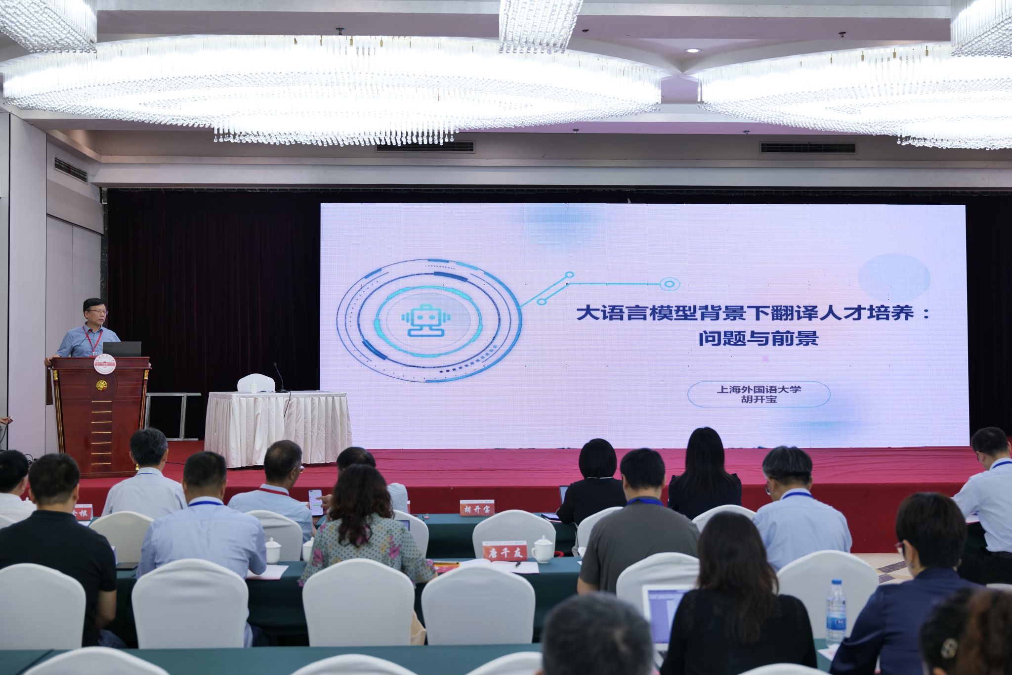 会议主旨报告环节,教育部国家重大人才计划特聘教授、国家社科基金重大项目首席专家、上海外国语大学语言科学研究院经理胡开宝教授,全国翻译专业学位研究生教育指导委员会副主任委员、广东外语外贸大学赵军峰教授,教育部社科重大攻关项目首席专家、全国翻译专业学位研究生教育指导委员会委员、上海交通大学朱一凡教授,国家重大人才工程特聘教授、教育部高等公司外指委法语分委员会副主任委员、全国翻译专业学位研究生教育指导委员会委员、南京大学刘云虹教授,中国翻译协会国际化服务专业委员会副秘书长、北京语言大学韩林涛博士等八位专家先后发言,就人工智能背景下翻译人才培养、智能语言服务、产教融合、徽派文化外译等论题作了精彩报告。
