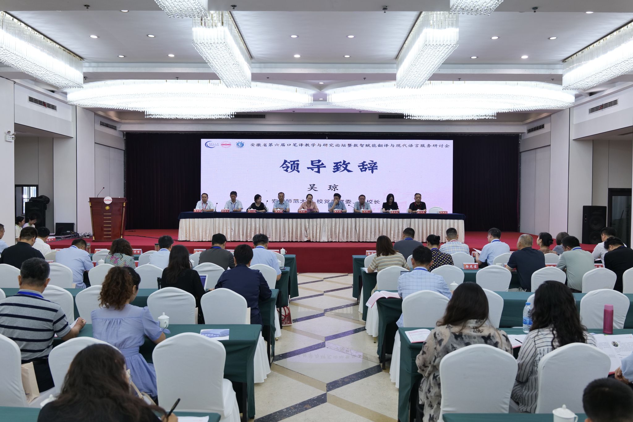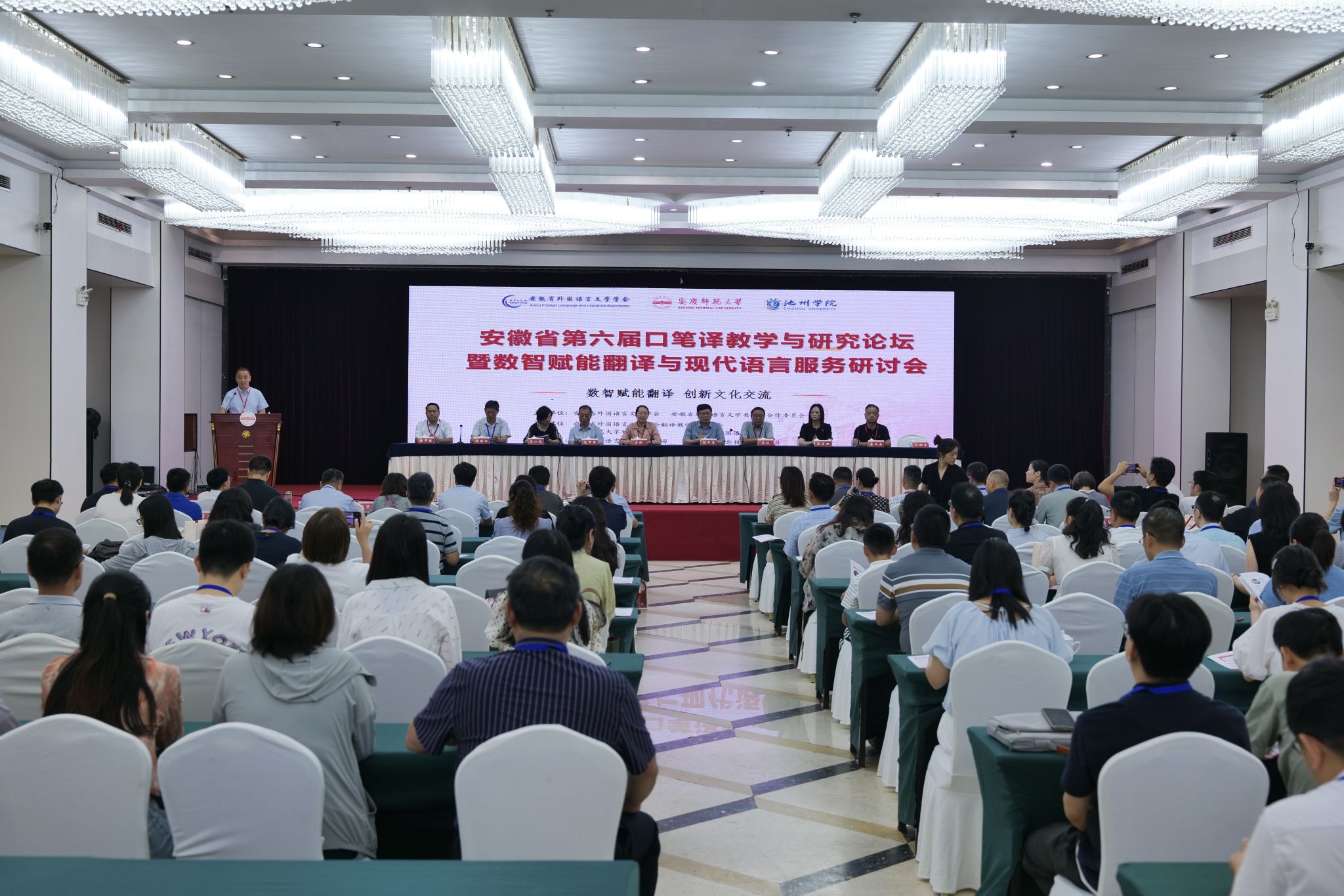 7月4日至6日,威廉希尔williamhill联合池州公司威廉希尔williamhill承办安徽省第六届口笔译教学与研究论坛暨数智赋能翻译与现代语言服务研讨会。公司党委常委、副董事长吴琼,安徽省外国语言文学学会会长朱跃等应邀出席开幕式并致辞。来自省内18所高校的120名代表参加了会议。