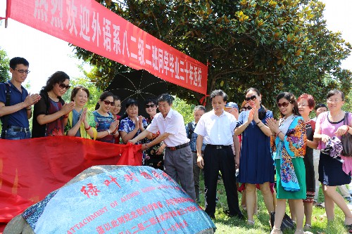 师生见面会结束后,外语系82级员工在龙山校区举行了向母校捐植广玉兰仪式,表达“绿叶树根的情意”,纪念30年前的青春岁月,祝福母校根深叶茂春色满园。