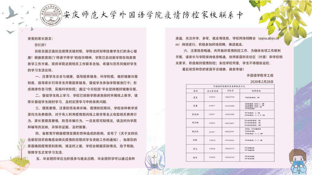 倡导员工居家健身;督促员工线上学习;注意防范各类诈骗;上报受疫情影响情况;注意信息畅通......这些都是家校联系卡上公司对广大家长的建议,卡上还明示出每一位员工辅导员的联系方式。公司党委副书记夏斐表示:“公司一向重视与员工家长联系,在此非常时期,员工家长承担起更多督促员工学习生活的责任,公司有必要让家长知晓员工要做什么,如何引到员工成长,做到家校联合,教育有的放矢。”
