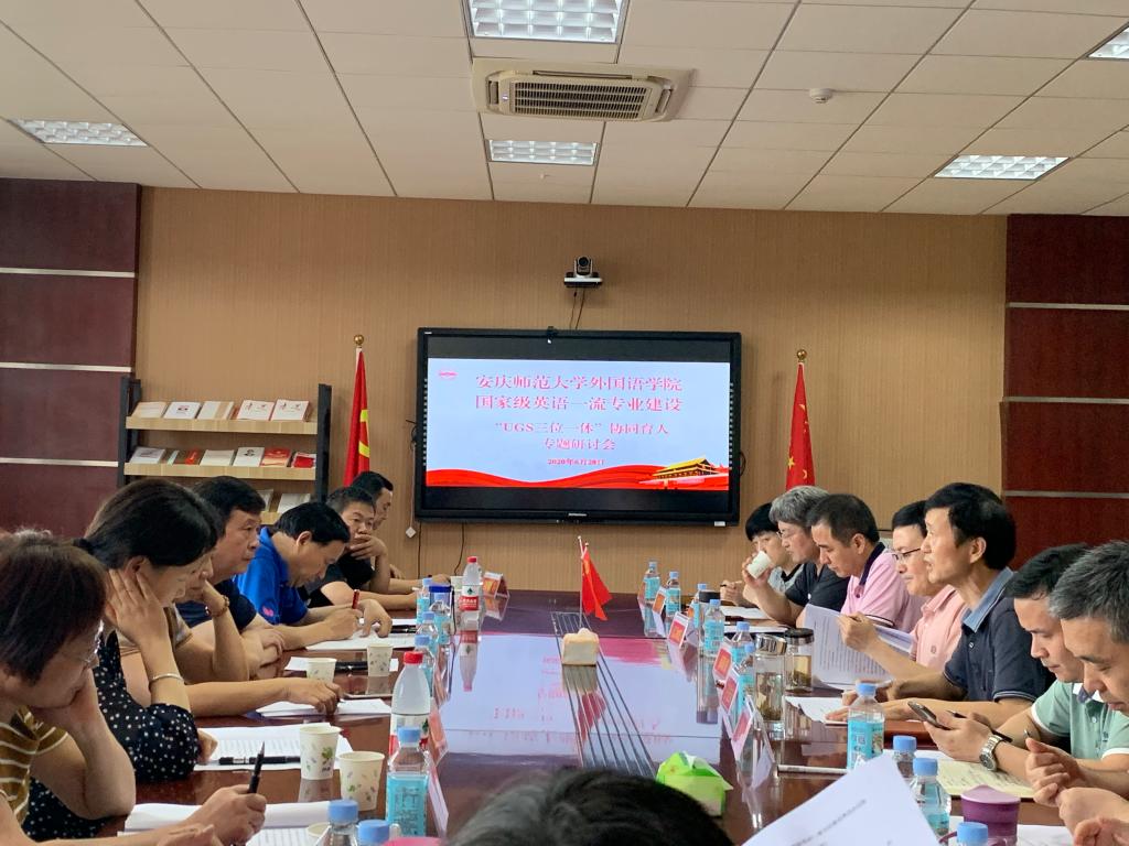 为了进一步深化校市合作,服务基础教育发展,推动公司国家级英语一流专业建设,6月28日下午,威廉希尔williamhill在E304会议室召开国家级英语一流专业“UGS三位一体”协同育人专题研讨会。安庆石化一中副董事长金安民、安庆市公司产品研究室副主任陈俊、安庆市外国语公司董事长黄文莉,以及来自安庆一中、二中、四中、七中、十中,安庆市迎江区、大观区、宜秀区、岳西县、怀宁县等区(县)的英语教研员及教学名师应邀参加专题研讨。公司党政领导、英语专业负责人及教师代表参加了会议,会议由经理王先荣主持。