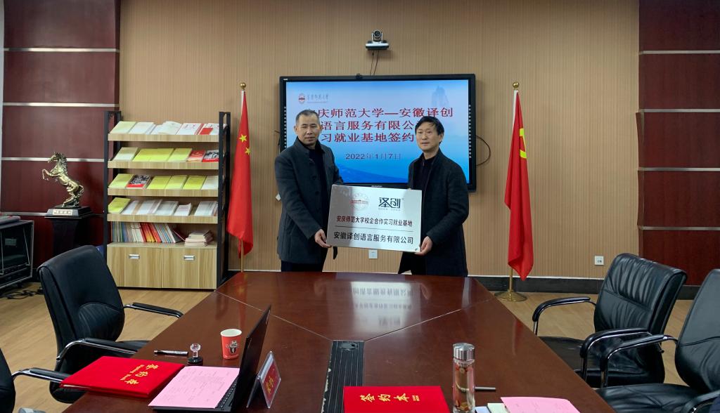 江加宏副经理和安徽译创语言服务有限公司执行总监朱小二代表校企双方签订了实习就业基地协议,王先荣经理和施永双总经理共同为基地揭牌。