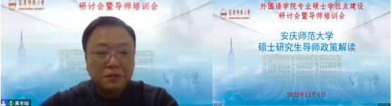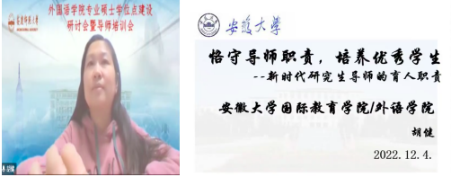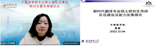 为深入学习宣传贯彻党的二十大精神,推进新时代研究生教育高质量发展,建设高素质研究生导师队伍,提升研究生导师指导水平,全面落实研究生导师立德树人职责,夯实公司翻译硕士和学科教学(英语)专业学位硕士点建设基础,12月4日下午外国语公司在腾讯会议平台召开硕士学位点建设研讨会暨硕士生导师培训会。安徽大学国际教育公司经理胡健教授、安徽师范大学威廉希尔williamhill副经理蔡静教授应邀参会并作专家报告。公司党政班子成员以及全体研究生导师、校外兼职导师、研究生共70余人参加了此次会议。会议由副经理黄全灿主持。
