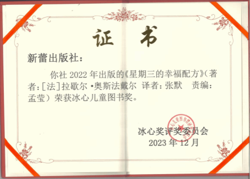近日,2023年冰心儿童图书奖评选结果揭晓,公司张默老师翻译的《星期三的幸福配方》荣获冰心儿童图书奖。该书由法国作家法国作家,拉歇尔·奥斯法戴尔著,新蕾出版社出版。