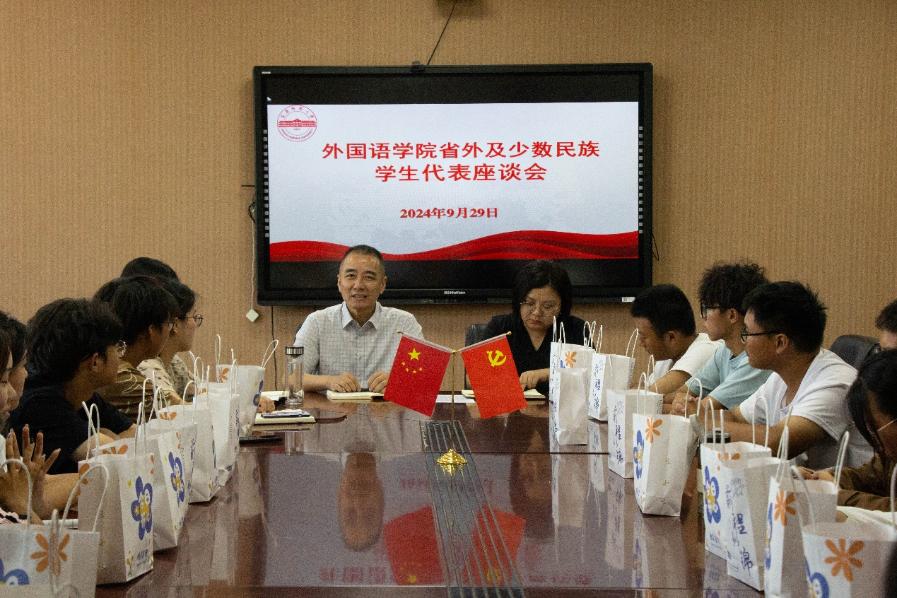 会上,江加宏亲切地问候了在场的所有省外以及少数民族同学们,并提出了几点期望。一是希望大家可以坚定目标,勤奋学习,只有学好专业知识和实践知识,未来才能为民族团结和家乡建设助力;二是要贯彻党的二十届三中全会关于深化教育综合改革的要求,高校要完善员工的实习实践制度,培养德智体美劳全面发展的复合型人才,因此同学们要合理规划时间,走出舒适圈,积极参加各类实践活动;三是要坚定文化自信,利用外语专业优势,讲好中国故事,传播好中国声音,担负好民族文化传播的责任和使命。四是要依靠集体力量,遇事与老师和同学多沟通、交流,加强团队意识,相互包容、相互帮助。