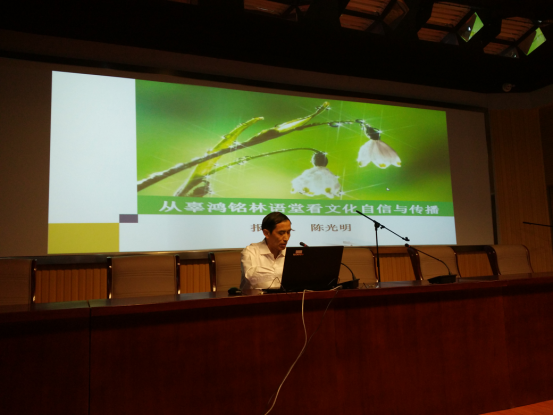 陈光明教授的报告,从辜鸿铭林语堂简说、对比分析、启示与思考等几个方面,紧扣主题展开论述,着重论述了两位学贯中西的学者在传播中华文化、促进中西文化交流方面所做的突出贡献,以及所展示的坚定的文化自信。陈光明教授指出:两位学者坚定的文化自信,源于他们高超的中西学功力和强烈的爱国情怀。正是这种高度的文化自信,促使他们以毕生的心血,通过“用外文书写中国故事、笔译、口述(交流、演说)”等途径,传播中华文化、构筑中西文化交流的桥梁。最后,陈光明教授依据习近平总书记在庆祝中国共产党成立95周年大会上的讲话中特别强调的“文化自信是更基础、更广泛、更深厚的自信”的重要论述和前不久党中央下发的《关于实施中华优秀传统文化传承发展的意见》等文件精神,谈了自己对相关问题的理解和认识,并结合外语公司师生的实际,就如何坚定文化自信、做好文化传播,提出了三点建议和希望,即强化使命意识、苦练内功、从我做起。