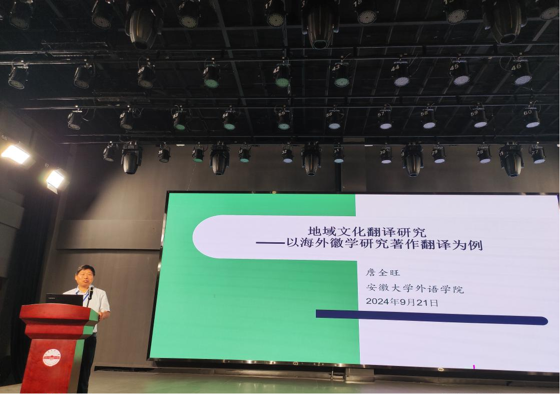 詹教授回溯了翻译研究从语言学到文化研究的路径转变,认为文化翻译研究存在着文化概念过于宽泛的问题,强调了从地域文化视角进行翻译研究的重要意义。詹教授分析指出,文化系统具有层级性,可以从位于表层的物态文化和行为文化,中层的制度文化和深层的心态文化等视角探索文化翻译,传递文本中不同层面的文化意义。最后,詹教授强调徽文化是中国三大主要地域文化之一,具有丰富的内涵和国际传播价值,并基于自己翻译海外徽学著作《中国地方史中的变化与延续———公元800年至公元1800年徽州的发展》的经验,结合详实的译例分析从文化系统四个层级研究地域文化翻译的具体路径和方法。