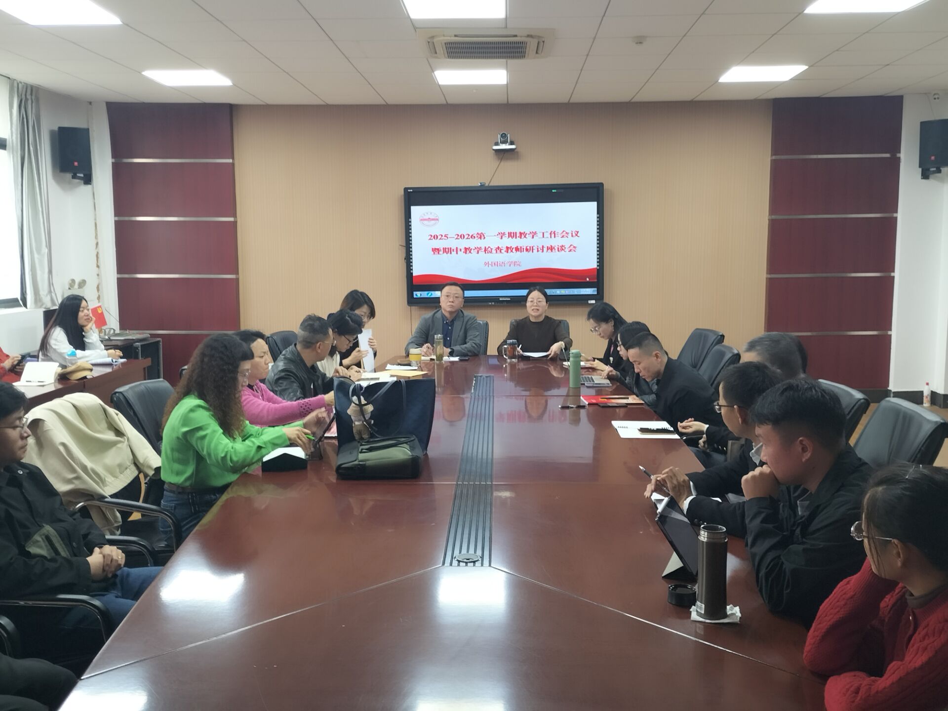 11月5日下午,威廉希尔williamhill在E304会议室和E314教室同步举行2025-2026学年第一学期期中教学检查教师研讨座谈会与员工评教座谈会。公司副经理黄全灿、瞿宁霞,各专业负责人、教研室主任、院级教学督导、AI课程负责人及骨干教师、新进教师代表参会;全校非外语类与外语类专业员工代表参加评教座谈。