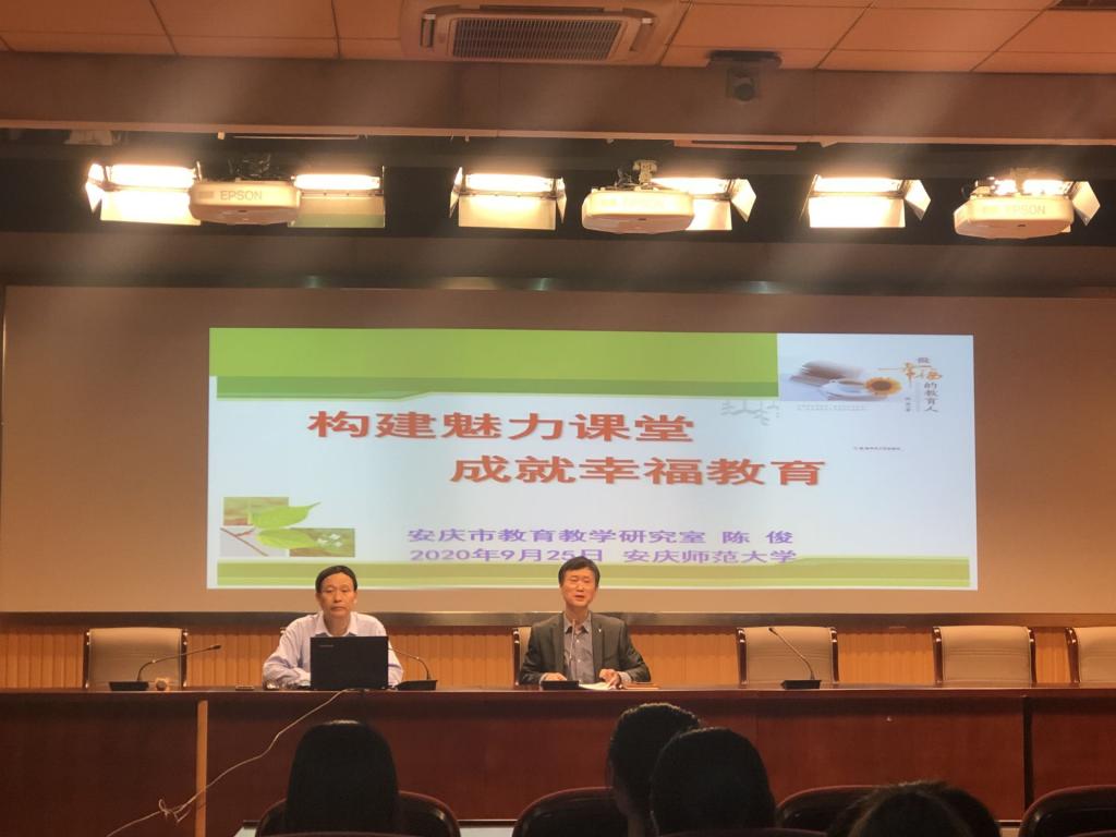 大会最后由安庆市教研室主任、正高级教师、特级教师陈俊为实习生作了题为“构筑魅力课堂,成就幸福教育”的报告。陈老师结合自己的英语学习经历、教学经历,从“树立幸福的教育梦想”“构筑专业成长的梦想”“追求魅力课堂的梦想”“探索教育主张的梦想”“成就科研兴教的梦想”五个方面详细报告了怎样构筑美丽课堂、如何成就幸福教育。在互动环节中,陈老师激励同学们不忘初心,通过努力学习、钻研照亮自己的人生。