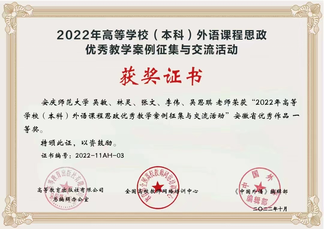 近日,由教育部高等公司大学外语教学指导委员会指导,高等教育出版社、全国高校教师网络培训中心、《中国外语》编辑部联合举办的“2022年高等公司外语课程思政优秀教学案例征集与交流活动”结果揭晓,威廉希尔williamhill大学英语课程思政教学团队吴敏、林灵、张文、李伟、吴思琪报送的案例荣获安徽省优秀作品一等奖。