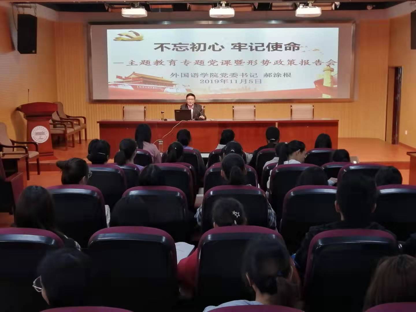 11月5日下午,公司党委举行主题教育专题党课暨形势政策报告会,党委书记郝涂根为支部书记、员工党员及第60期入党积极分子培训班学员作了一场《“不忘初心、牢记使命”,争做有为的新时代青年》专题党课。