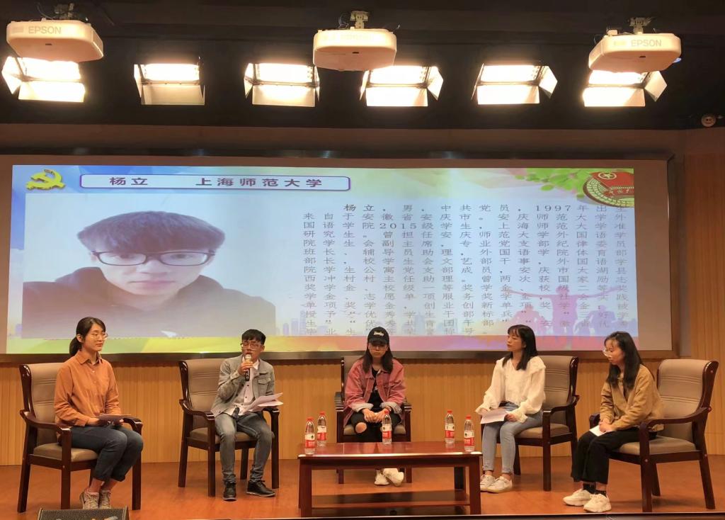 来自翻译、英语、商务英语和合作四个专业的四位2019届优秀毕业生党员从学习、工作、生活三个方面入手,用朴素的语言、真实的事例,讲述了他们大学四年中如何践行党员模范作用、如何用榜样的力量影响带动其他同学共同进步的成长感悟。同时就研究生备考、班级管理、考级考证等问题分享了自己的体会。
