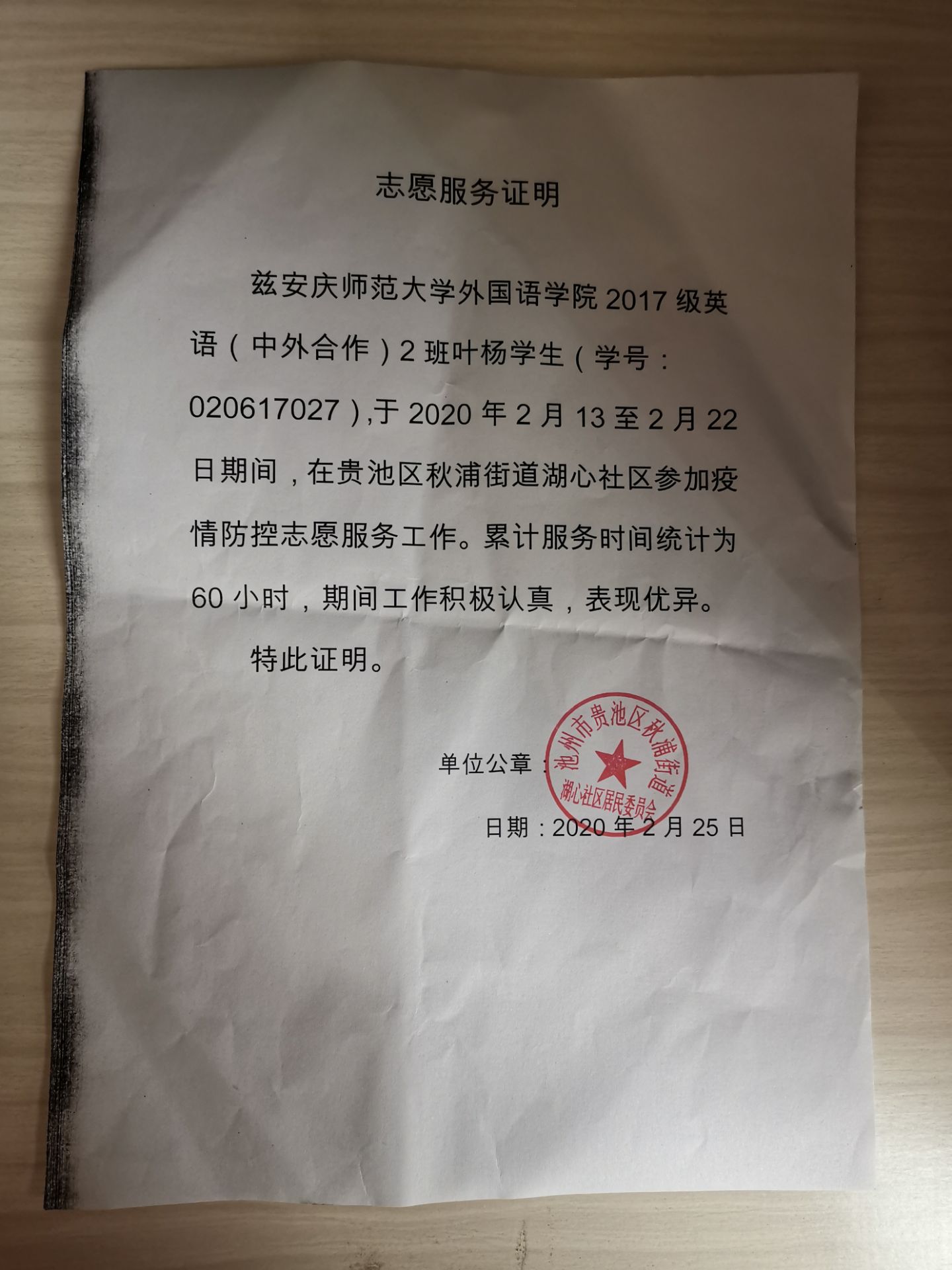 响应村干部号召,2019级商务英语专业的张灵志愿参与防疫工作。在2月15-16日于黄山市休宁县霞阜村桥头协助基层干部进行出入人员登记和车辆登记、搭建帐篷、分发口罩和协助整理政府文件等工作。张灵是第一次参加社会志愿服务活动,他表示:“很累但是很自豪,身为一名老员工,一名入党积极分子,在国家有困难的时候站出来,尽自己的一份绵薄之力是我的职责。”
