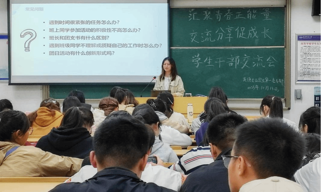 会上,担任了三年班长,2021级英语8班的王佳慧从与辅导员、与专业课老师、与班委和与同学的关系四个方面详细展开叙述,表达了作为一名班干,应该具备责任意识、主动意识和提前意识。2021级英语2班创新创业委员郑倩茹通过自己参加创新创业类赛事的亲身经验鼓舞同学们积极挑战自己,“勇敢是走向成功的第一步。”2021级英语5班的毕艺源分享了作为学习委员的经历及经验,一是确立⻆色定位,认真学习,做好榜样;二是做好本职工作,积极沟通,高效做事;三是努力提升自己,不断尝试新事物。其他班委纷纷表示,在工作中一定要努力掌握方法,及时更新工作观念,以便更好地为同学服务。