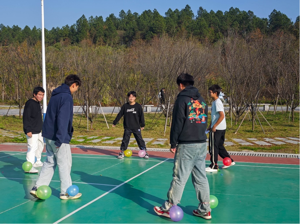 “踩气球”一度成为全场热门游戏,引来了许多同学观看。同学们将气球绑在脚上,既要保护自己的气球,又要尽力踩破别人的气球,最终气球未被踩破者赢得比赛。“嘭嘭嘭”,场内传来此起彼伏的气球爆炸声。2024级外国语言文学类7班熊雅雯用手捂着自己的耳朵,既害怕自己脚上的气球被踩破,又要将身体后倾,把脚伸出去尽全力踩破对方的气球。“这个游戏特别有趣,我在踩对手的气球时,踩了好几次都没踩破,结果稍不注意,只听见嘭的一声,我脚上的气球被身后的同学踩破了,只能遗憾出局。”