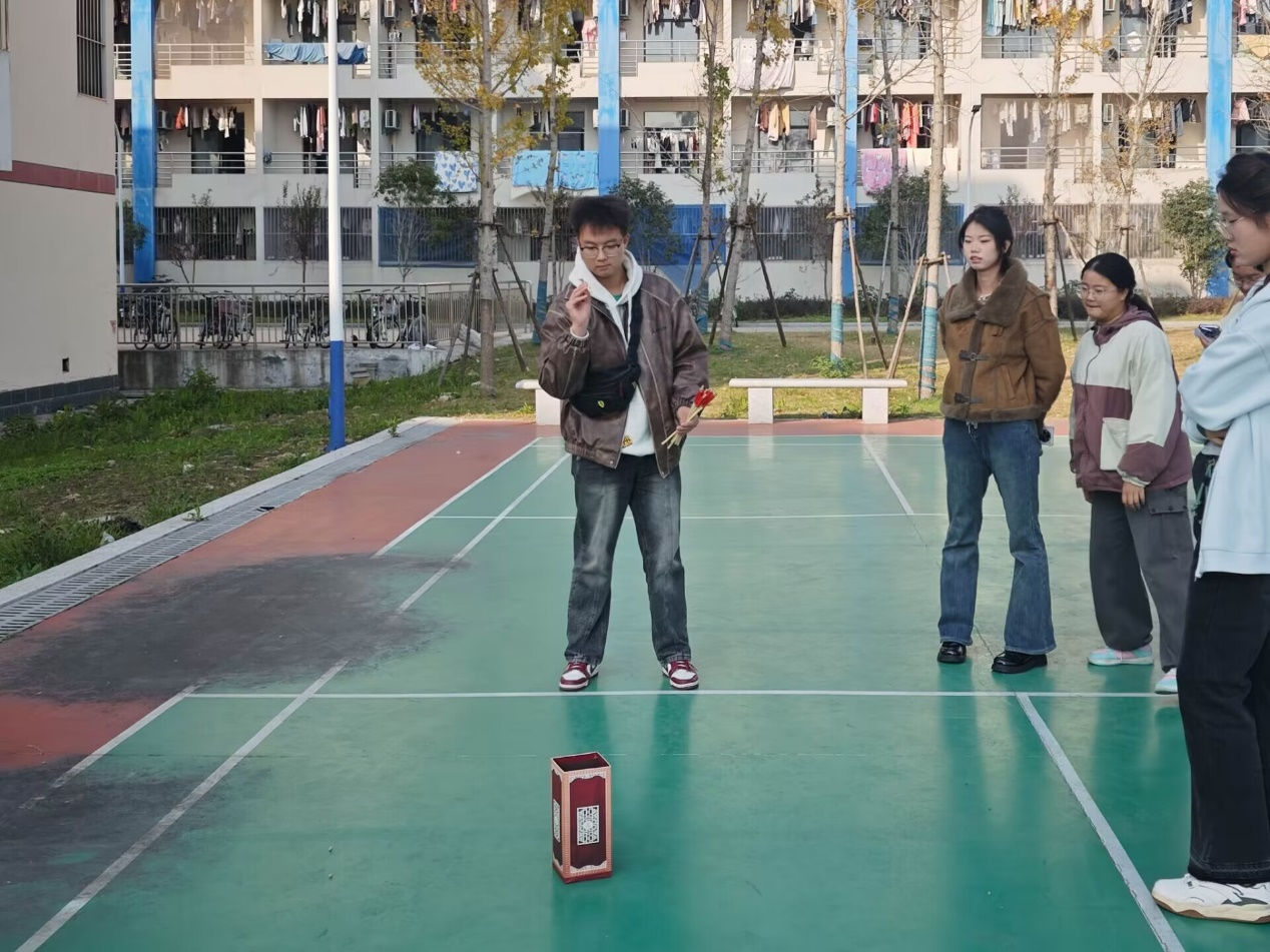 “后羿射日”活动中,同学们每人分到十支箭,投进四支才视为成功。2024级外国语言文学类6班朱裕镯站在横线处,屏住呼吸,全神贯注盯着投壶,将手中的箭向壶中投去,只见箭在快进壶的时候,却又被壶的边缘弹开了,在场同学纷纷表示可惜。“这个游戏看似简单实际难度很大。”朱裕镯表示,“我又多练习了几次,慢慢的领悟到了诀窍,投的时候要快,避免接触壶,这样便能稳稳落入壶中。”