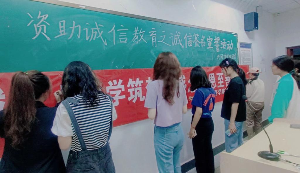 活动中,受资助同学详细阅读资助诚信承诺书并签名,主持人带领同学们郑重宣誓。他们右手握拳,跟诵誓词,誓言铿锵有力,掷地有声,生动诠释了同学们以诚立身的决心与信心。最后,大家自发地走上讲台在活动横幅上签下自己的名字,表示对国家资助诚信教育活动的支持。