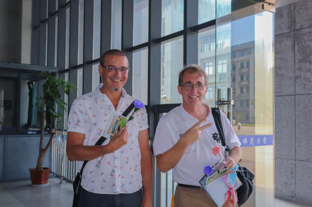 “在我们国家不是非常重视教师节,在这里我感觉中国员工非常热情。”这是外教老师Simon过的第三个教师节,他在收到小惊喜后连连赞叹,主动与分发礼物的员工合影留念。他表示,非常感谢员工们的小礼物,康乃馨和玫瑰花都很精致,员工们还细心得用英语写了祝福,希望员工们好好学习,每天进步一点点,提高自己的学习能力。