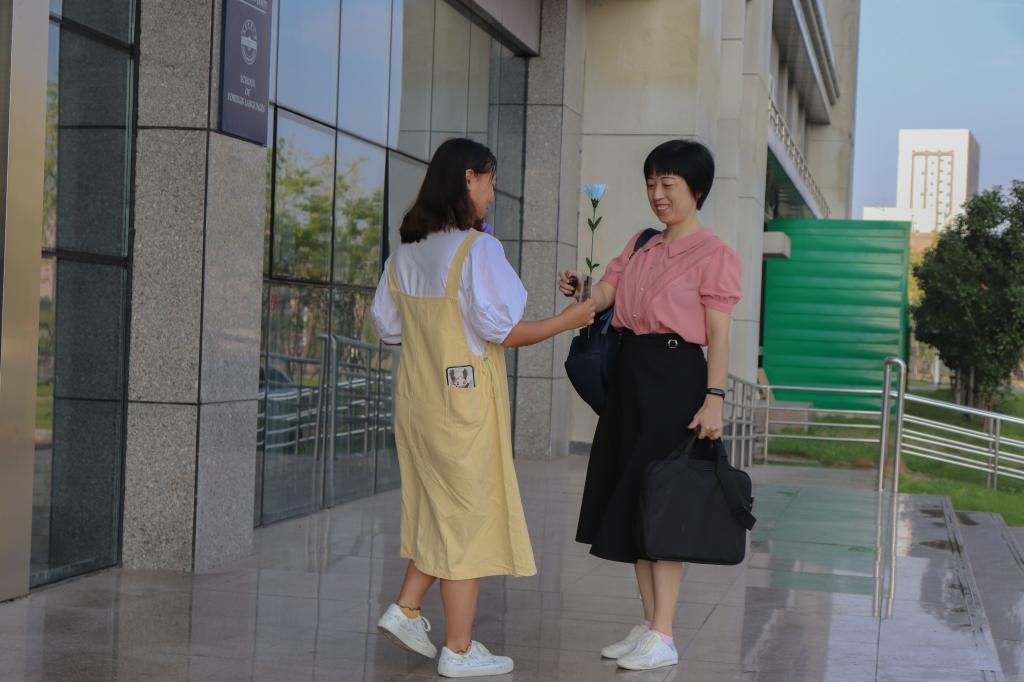 英语专业2020(8)班的王碧莲一直站在公司门口准备明信片和花束,为来往的老师送去节日祝福。她说:“很开心能够参加这次活动,为我们公司奉献出了一份力量。这次参与的人数比较少,但是我们每个人都在尽自己的努力,把事情做到最好。”她表示,自己以后也想当一名人民教师,去培育更多的人才,为祖国的教育事业贡献出一份力量。