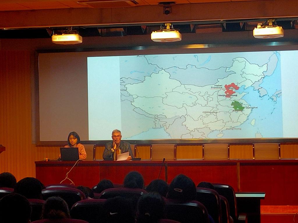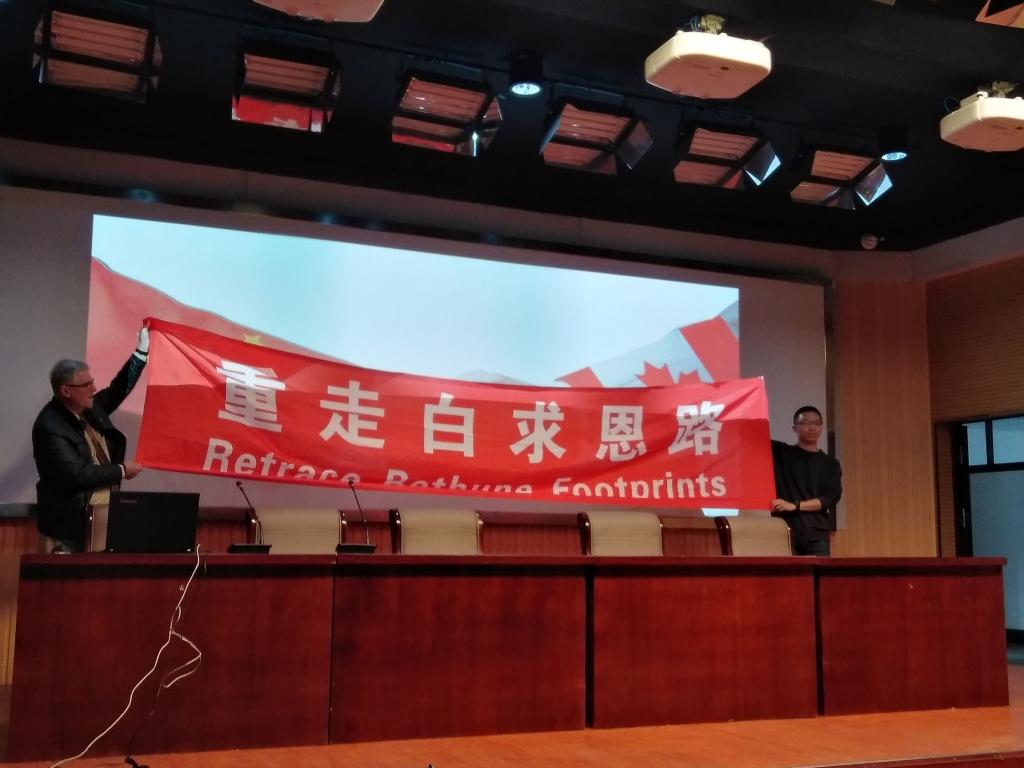 Stephen曾在公司威廉希尔williamhill任教八年,此次专门从加拿大来中国回访公司,并特意为威廉希尔williamhill的学子们准备了这场讲座。本场报告以中加友谊为主题,首先对白求恩同志生平事迹作了简单介绍;紧接着,Stephen详细描述了他探寻白求恩之旅。最后,Stephen强调重走白求恩路,源于中加友谊,亦源于与安庆师大的情谊。