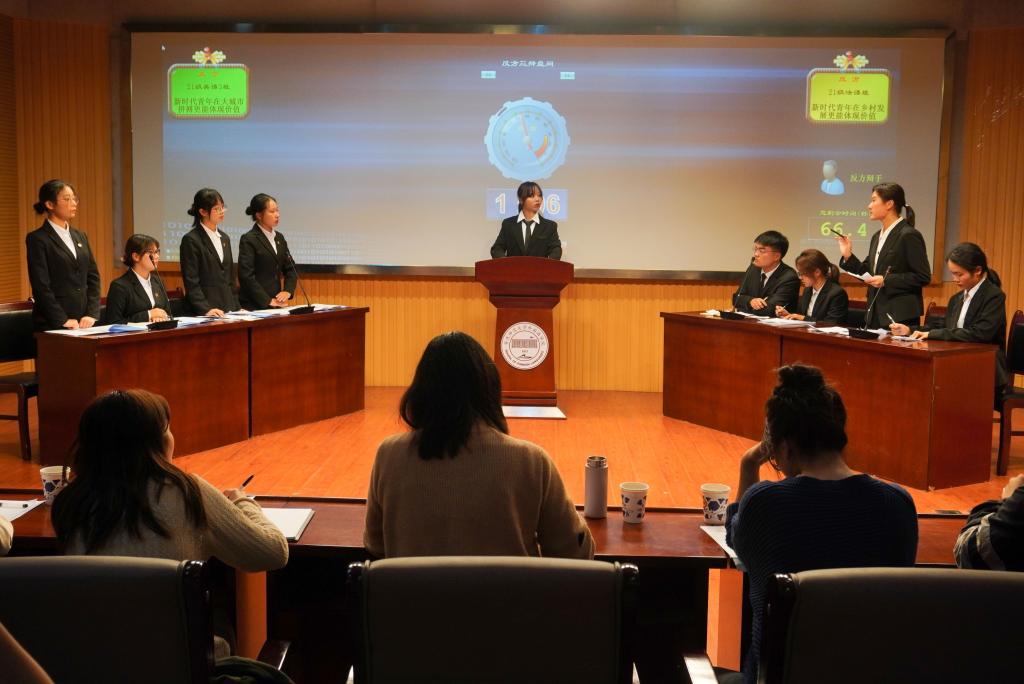 比赛进行到第二场,外国语言文学类专业2021(3)班代表队与法语专业2021级代表队围绕“新时代青年在城市拼搏还是在乡村发展更能体现价值”展开激烈辩论。“乡村需要何种类型的人才?”“是否承认乡村振兴需要特定的人才?”“乡村振兴需要的人才与辩题中的新时代青年是否一致?”……正方外国语言文学类专业2021(3)班代表队从反方辩题的角度出发,步步紧逼,寻找漏洞,对反方队伍展开犀利盘问。“如今国家对投身于乡村振兴战略的人才进行政策扶持,他们扎根农村、服务农村,不能把他们局限于特定的专业群体。”反方二辩法语专业2021级的王希通过列举老员工村官秦玥飞的事例从容应对,毫不示弱。双方辩手针锋相对,唇枪舌战,将现场气氛推向高潮。