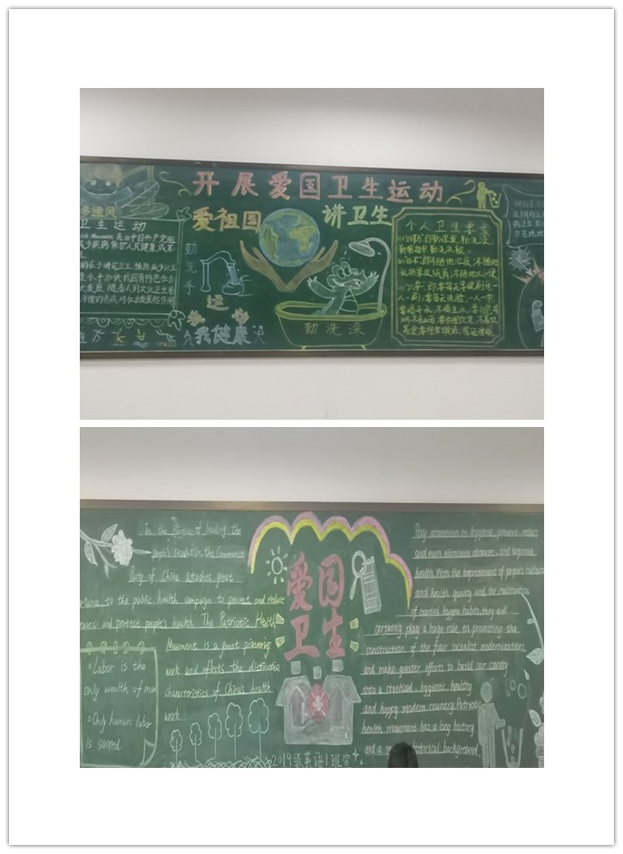 “爱国卫生运动”为主题的黑板报评比活动中,各班级在生活委员的带领下认真收集资料,精心构思版面。同学们绘画绿色地球的卡通形象,清晰地概括出“爱国卫生”的主要内容;设计抗疫主题的典型元素,形象地描述出做好疫情防控的主要措施;罗列真实且具体的数字,直观地说明培养健康的生活方式的重要性。一幅幅创意新颖、主题鲜明的板报,都流露了青年员工对建设健康美丽中国的美好祝愿。2019级英语5班的板报负责人都熠在谈及绘制初衷时说道,“希望这种宣传方式能让同学们了解更多的卫生知识,提高防范疾病的自我保护意识,增强个人体质。”