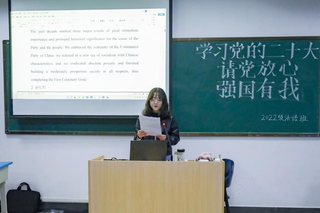 “Now we are taking confident strides on a new journey to turn China into a modern socialist country in all respects……”目视电子屏幕,大声朗读英文,外国语言文学类专业2022(10)班的李婷近日参与了一场别样的学习会,会后她激动地说:“学党史、强信念、跟党走,我们要坚定理想信念,为更美好的明天而奋斗。”