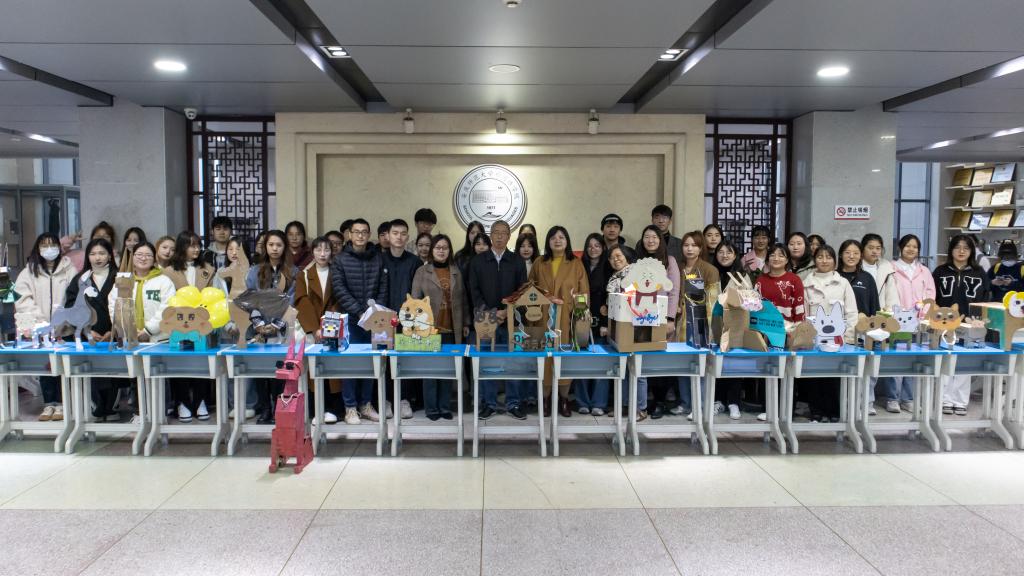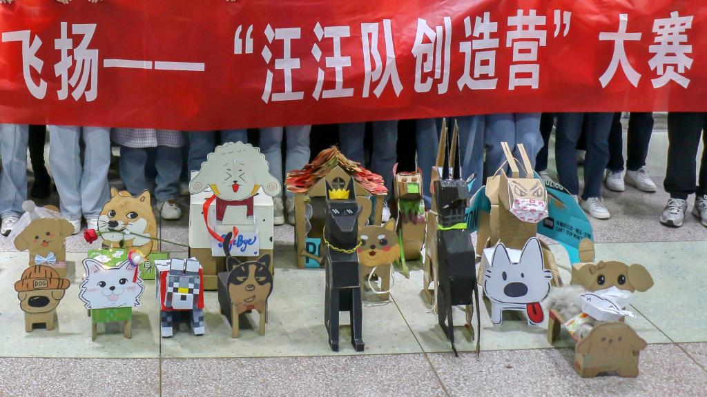 各种造型各异的纸箱小狗整齐摆放在桌子上,有的“主人”现场表演遛狗,引得员工纷纷驻足拍照,更有员工提出想要领养一只宠物狗。外国语言文学类2022(4)班的黄丽娟便是其中一员,她表示,由于缺乏材料,自己一直没能亲手制作纸箱狗。“感觉大家的作品非常棒,有机会的话,我也要做一只纸箱狗!”