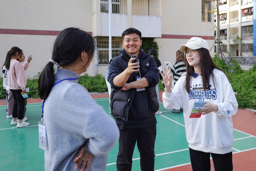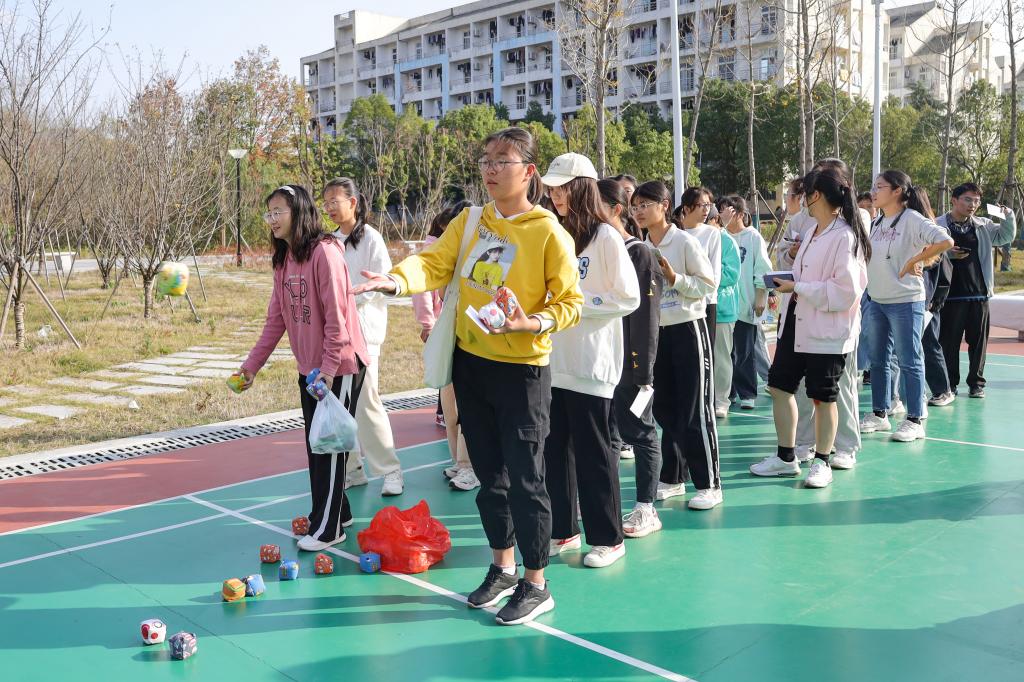 丢沙包游戏一度成为全场热门游戏,不少员工在该场地内排起了长队。参与员工有五次投沙包机会,成功将三个及以上沙包丢进桶中即算游戏胜利。有着四次失败经历,外国语言文学类专业2022(12)班的吴飞身为“老玩家”,认为该游戏“看似简单实则难”。在第五次游戏中,他成功投进3个沙包。看着明信片上的印章,他说,“像是上幼儿园时老师盖在脸上的小红花,有种满满的成就感。”