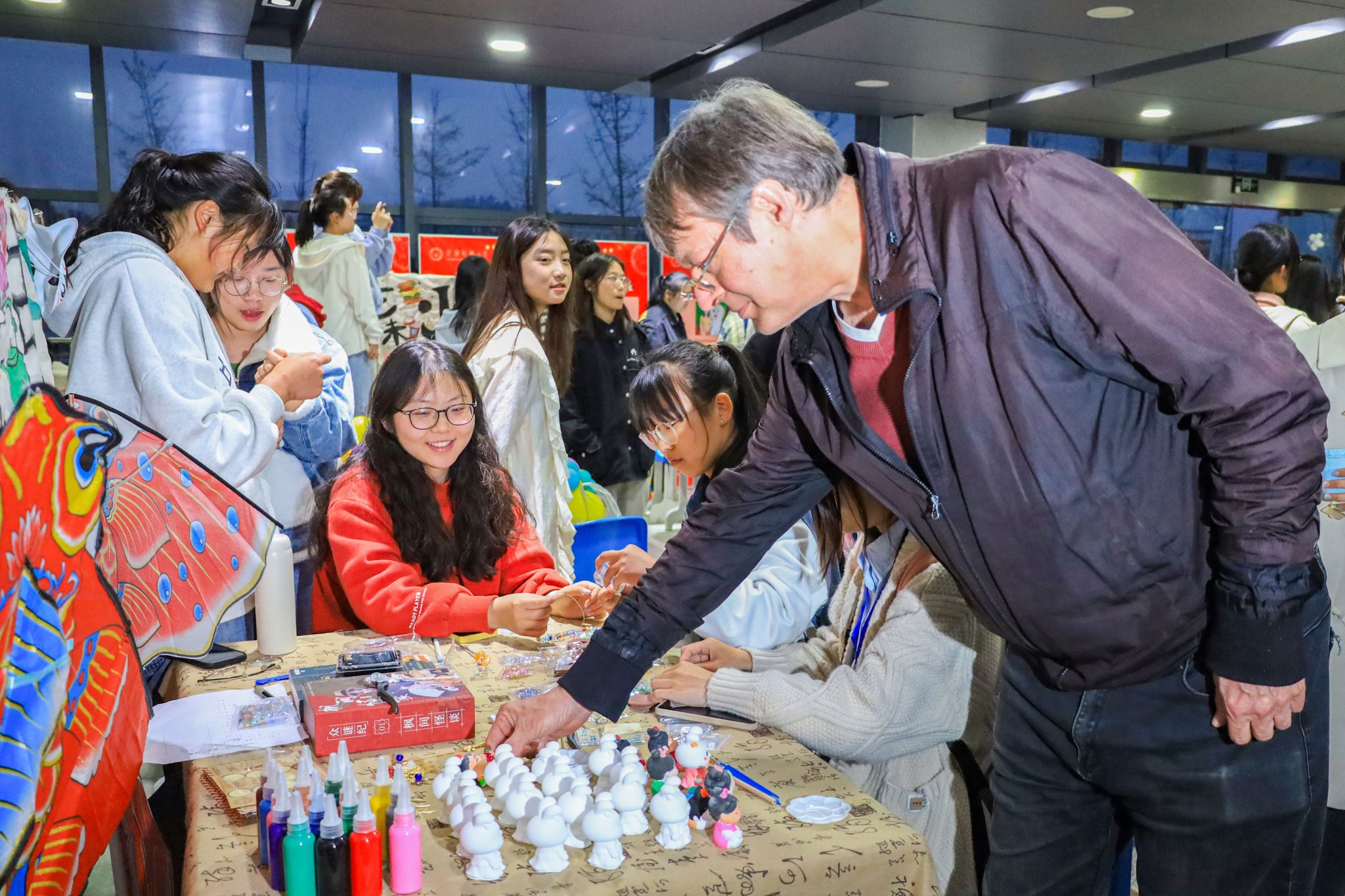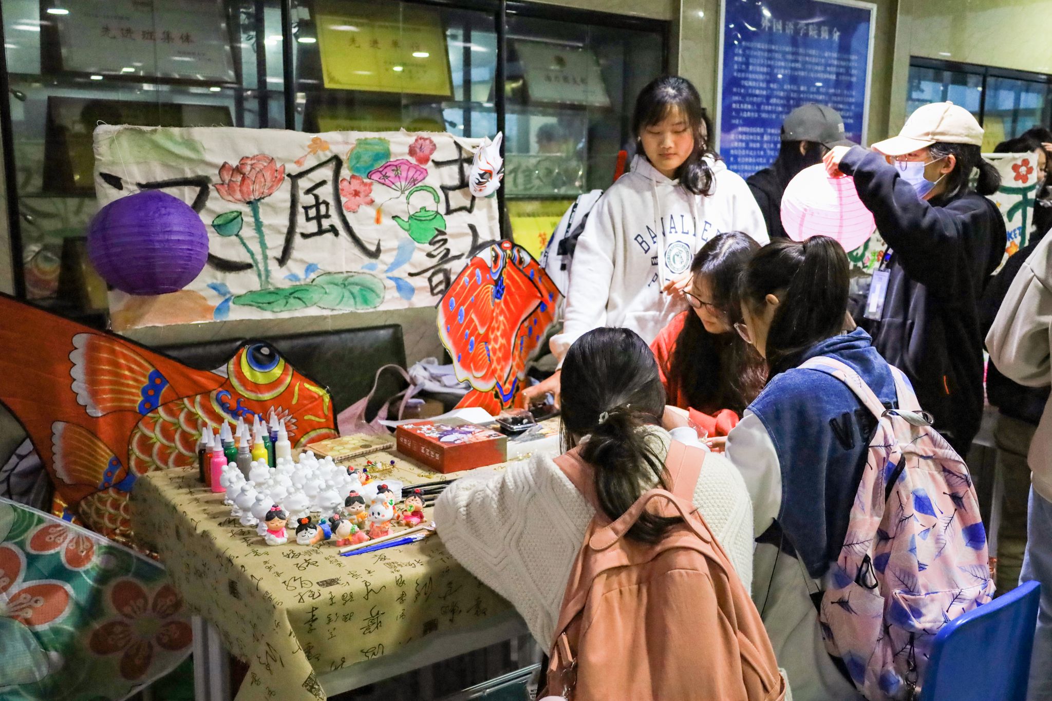 古典含蓄的书法扇面、形态可爱的石膏娃娃、精致美观的纸鸢……威廉希尔williamhill的汉风古韵铺和美术公司的艺见倾心展合力打造“艺术天堂”,引得不少员工停足驻留。外国语言文学类专业2022(3)班的丁明雅现场制作古风手链,直言“过了把古风瘾”。