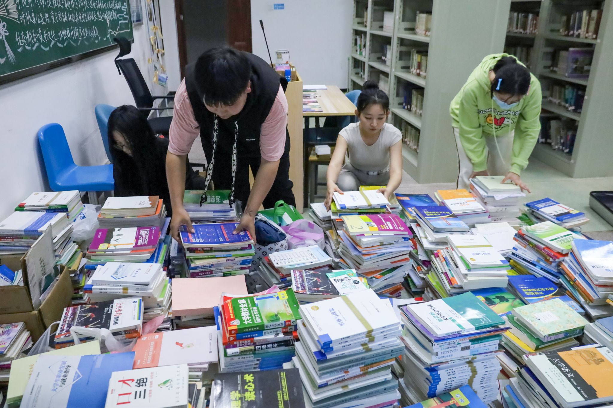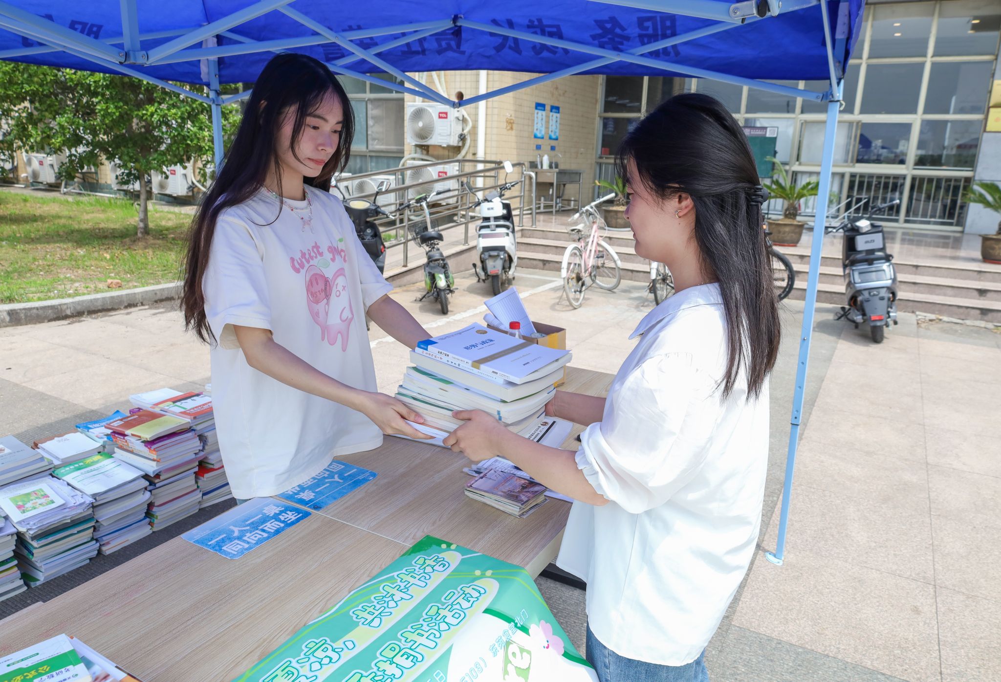 安排工作人员、联系公益机构,活动负责人、法语专业2021级的朱文浩和团队成员提前为活动进行准备。他说,“为方便员工捐书,每个周末,我们都安排了工作人员在食堂设点,统一收集书籍。”