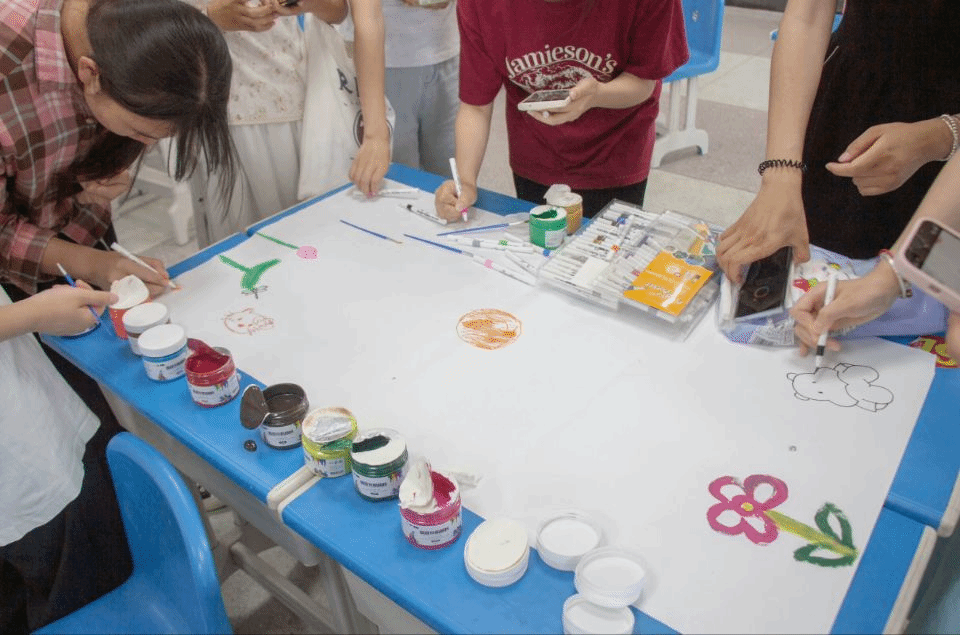 “可以画向日葵!”“这里还有空隙!”“小猪代表我可爱的朋友。”……参与员工在绘制过程中的欢笑声不断。外国语言文学类专业2023(9)班的李仕菊将蜜蜂、太阳和向日葵画在画布上。“对我而言,这些元素意味着爱和未来,希望能为更多人带去鼓励和支持。”