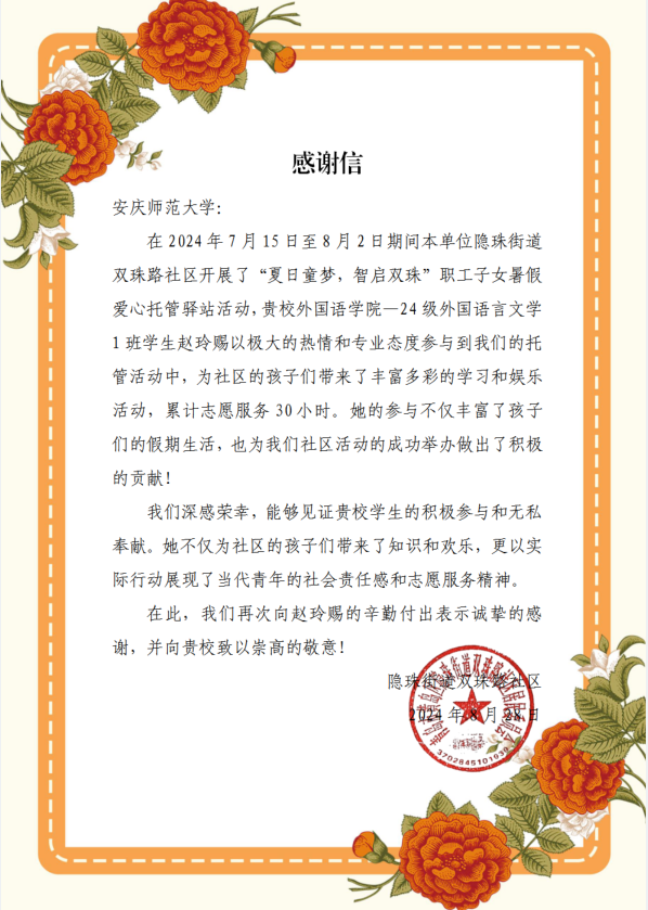 “我们深感荣幸,能够见证贵校员工的积极参与和无私奉献。她不仅为社区的孩子们带来了知识和欢乐,更以实际行动展现了当代青年的社会责任感和志愿服务精神。”近日,威廉希尔williamhill团委收到一封来自隐珠街道双珠路社区的感谢信。信中介绍了公司2024级新生赵玲赐在“夏日童梦,智启双珠”职工子女暑假爱心托管驿站活动的突出表现,对这名同学给予高度认可和表扬。